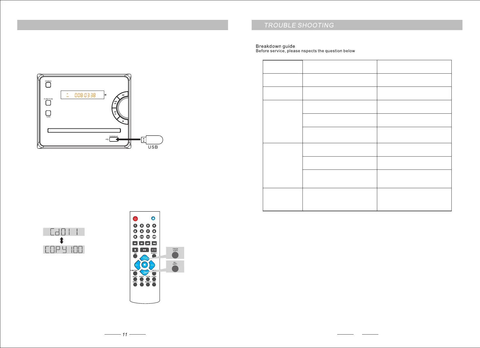 1.While playing a CD track , insert a USB drive to the USB port. Press Track Copy on the remote control