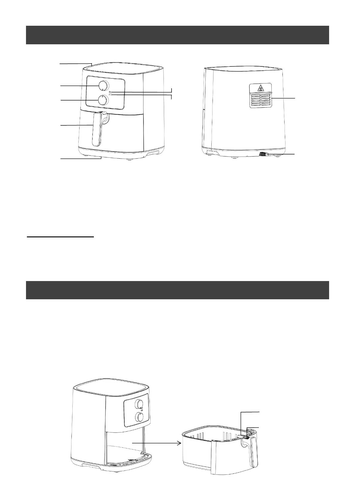 2. Slide out the basket and pan, place on a flat surface, push forward the button cover, and separate the