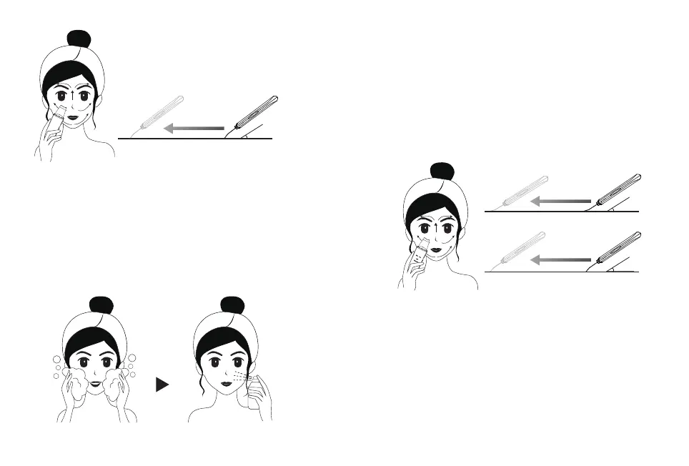 角度でやさしく肌に当て、矢印→の方向に向かって顔全体に滑らせます。