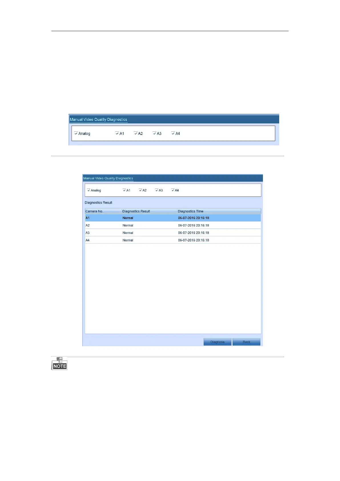 The video quality of the analog channels can be diagnosed manually and you can view the diagnostic results from