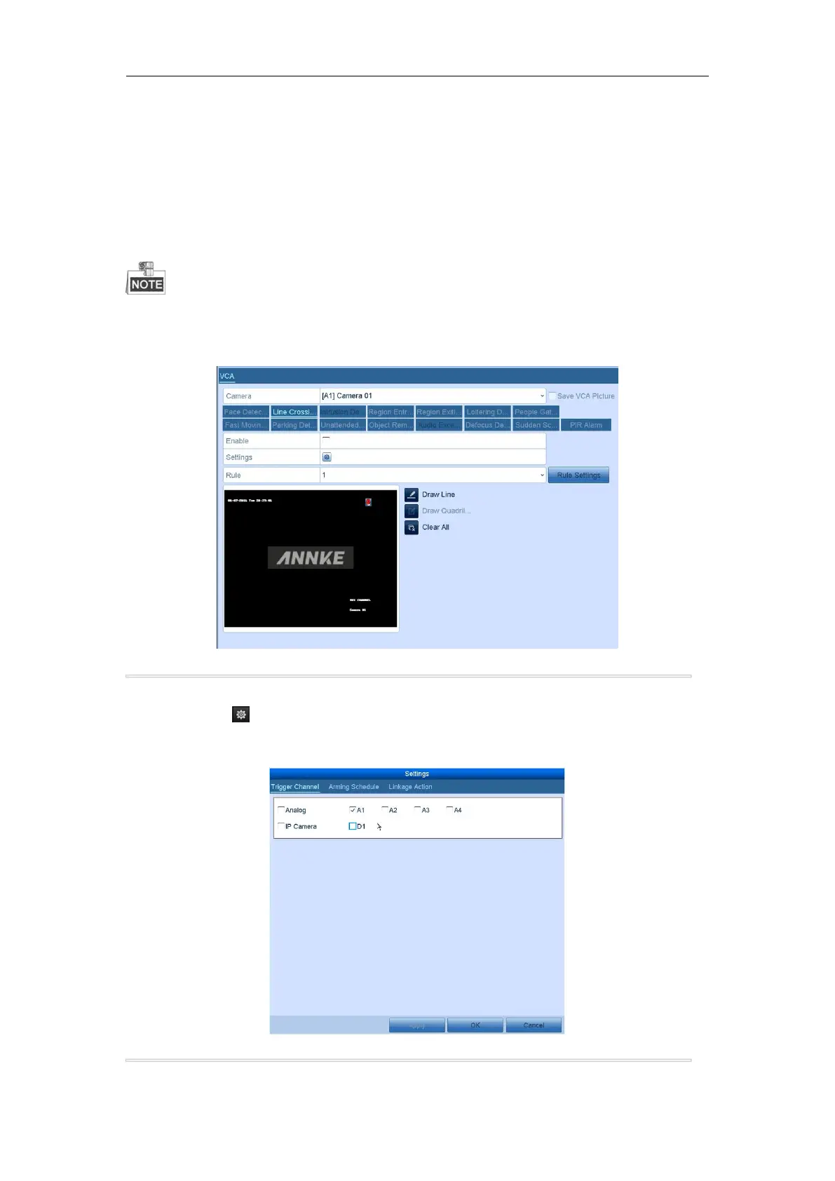 Only one analog camera supports the VCA settings and VCA alarm of line crossing detection, intrusion