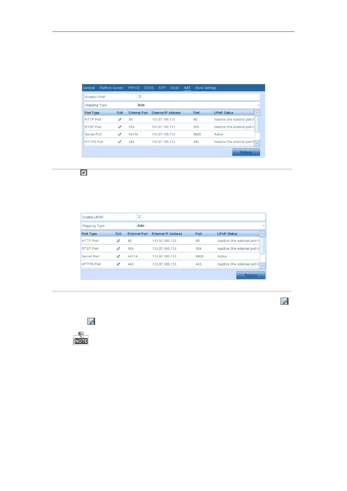 1) Click to activate the External Port Settings dialog box. Configure the external port No. for server