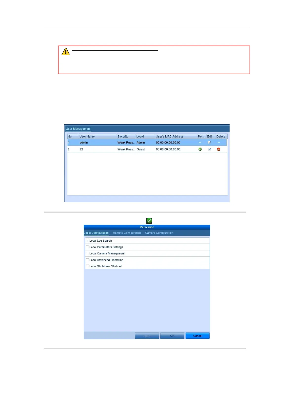 (2) Set the operating permission of Local Configuration, Remote Configuration and Camera Configuration