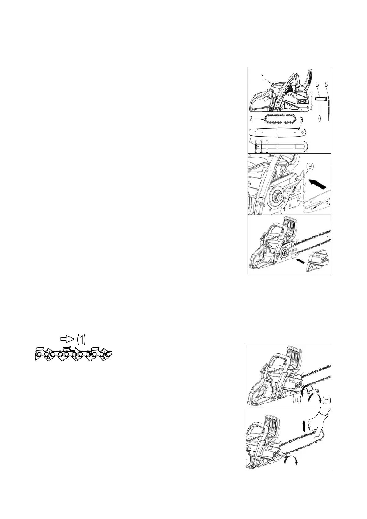 chaîne dans le trou sous le guide-chaîne. Engagez la chaîne sur le pignon et, tout