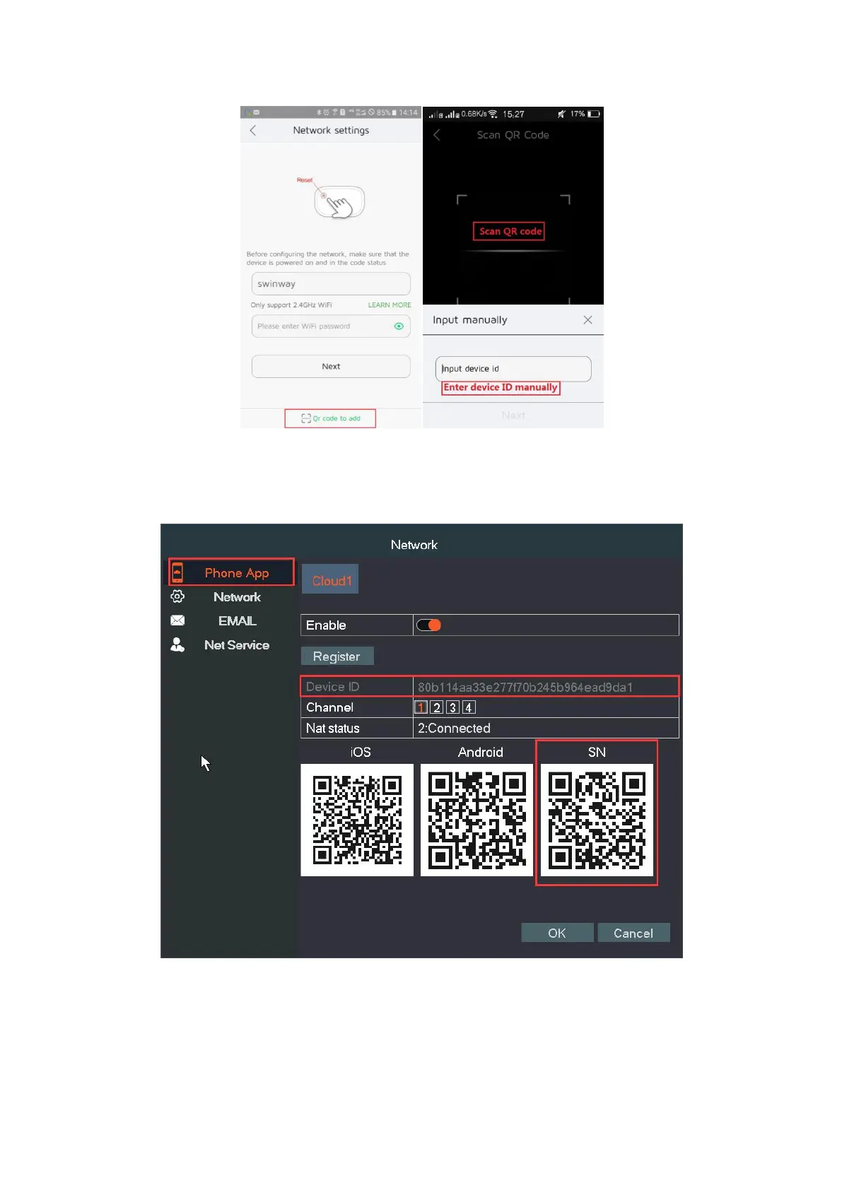 settingsPhone APP, you can find the Device ID and SN QR code.