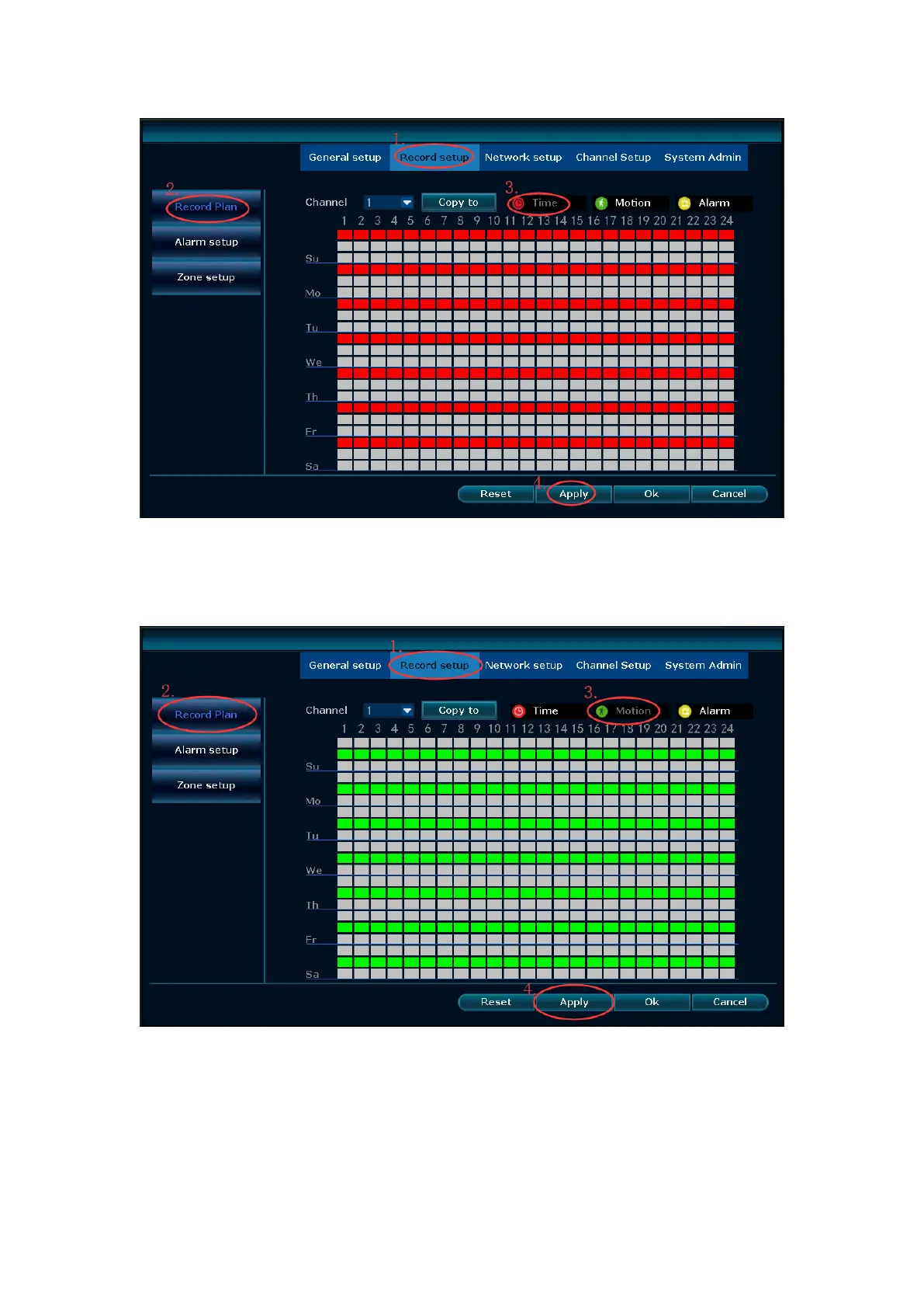 selecting “Motion”, the channel will record only when motion detected. (Please refer