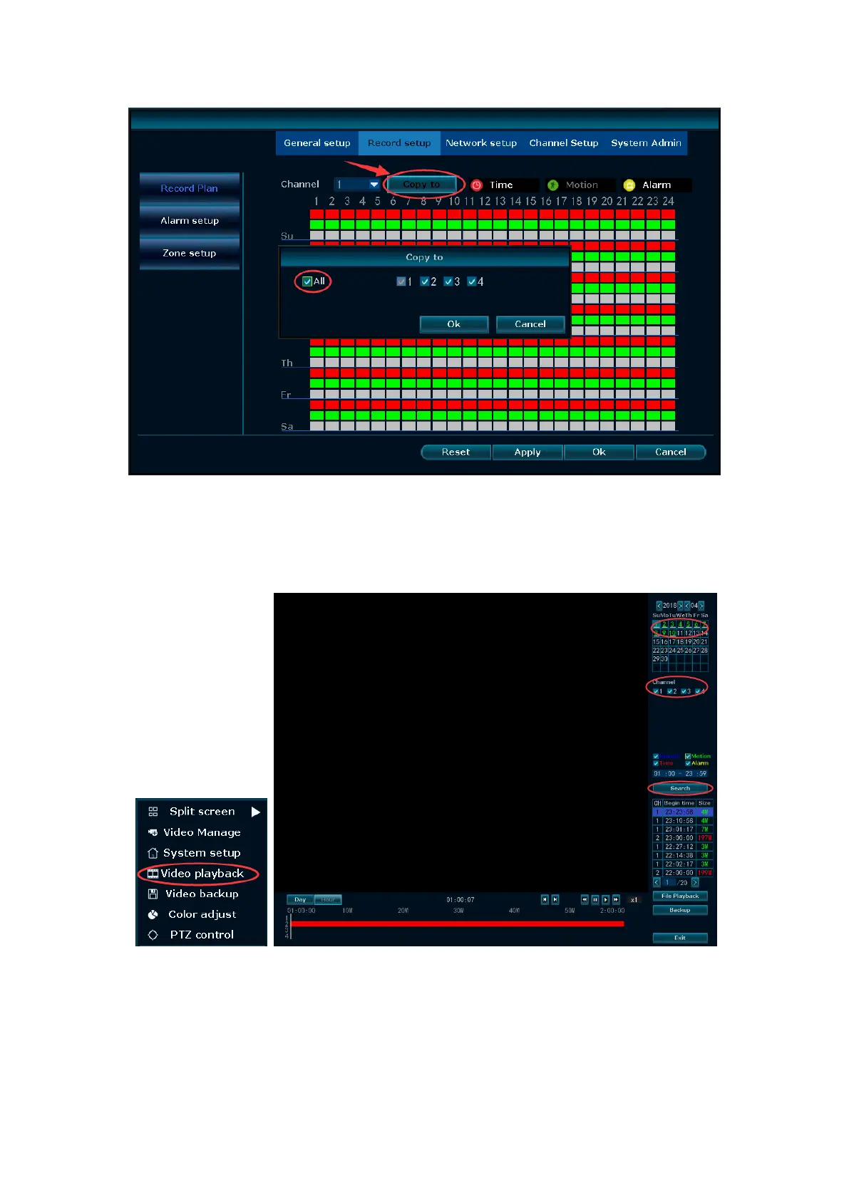backup→choose the channel and time period→Search→Choose the video clips you