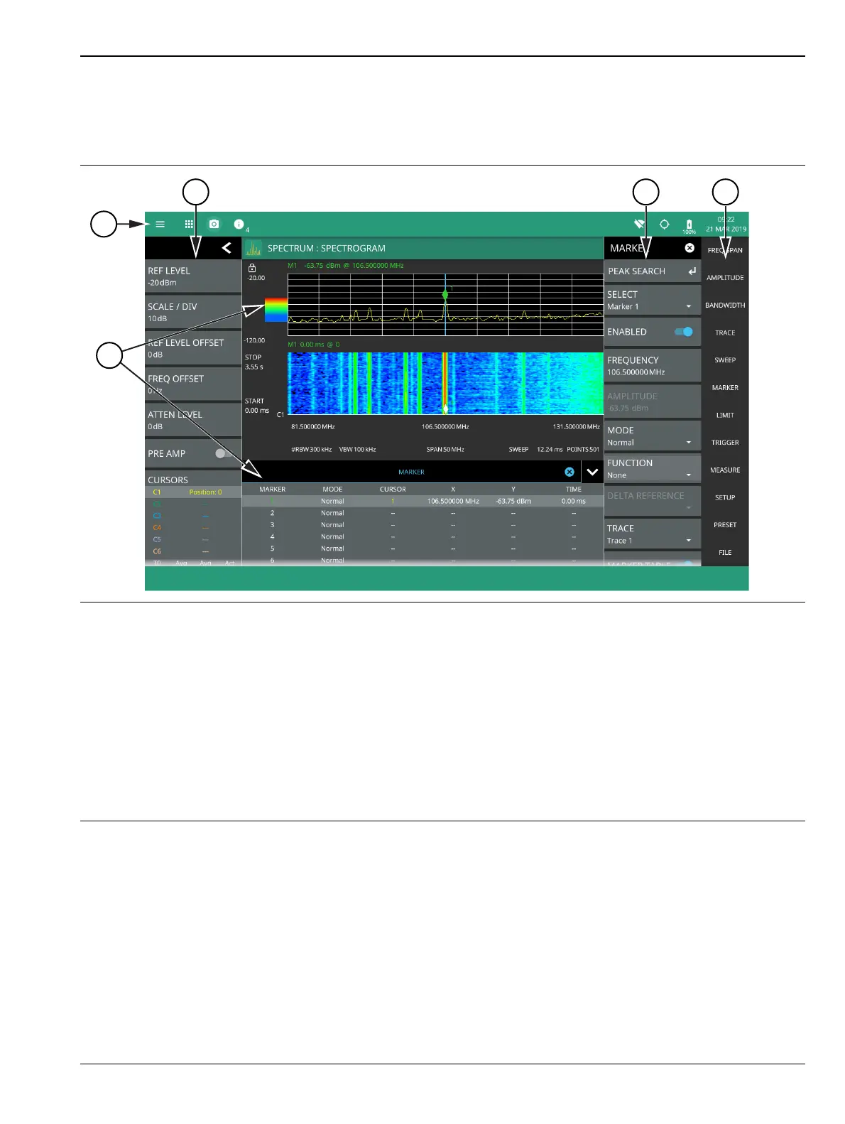 5. The upper area typically displays graphical data such as spectrum trace and spectrogram plots. The lower area