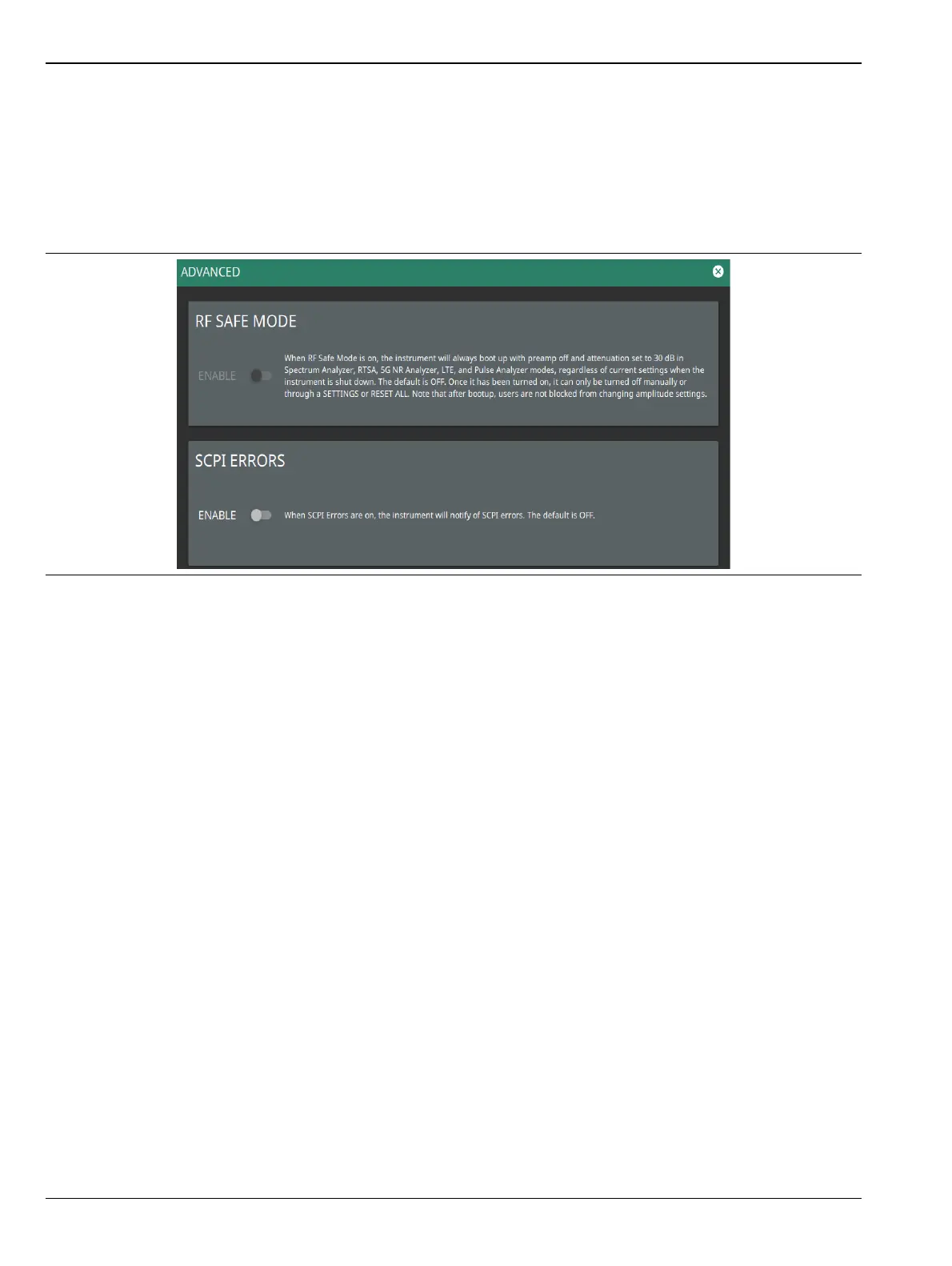 3. Select ADVANCED to enable/disable the RF SAFE MODE and SCPI ERRORS controls.