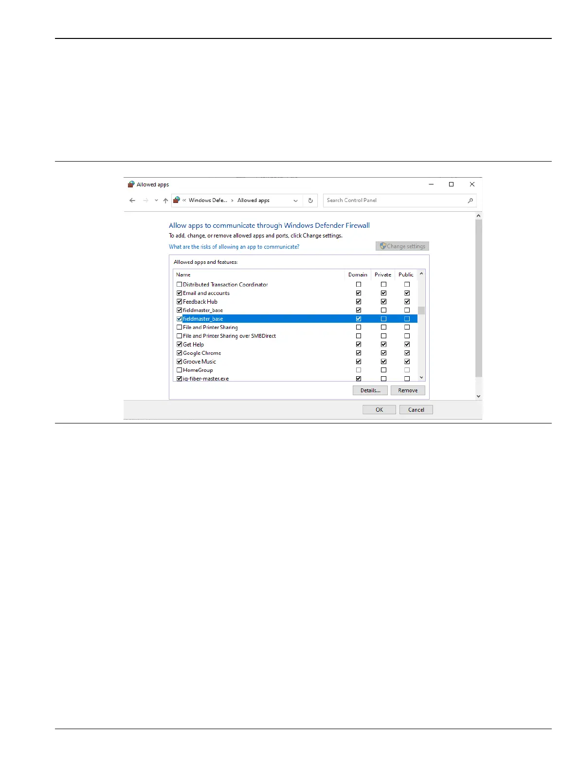 5. Click OK. Note that if the fieldmaster_base is missing, click Allow an app or feature through Windows