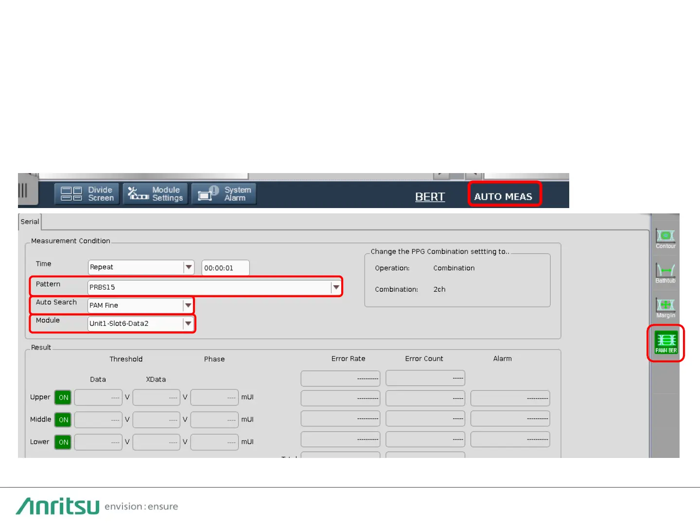 7. Click [AUTO MEAS] and click [PAM4 BER] listed in the auto measurement side menu bar on the
