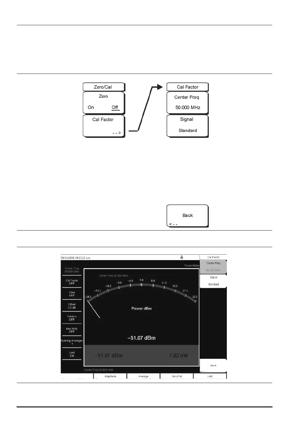The Zero/Cal menu choices are shown in the following illustrations.