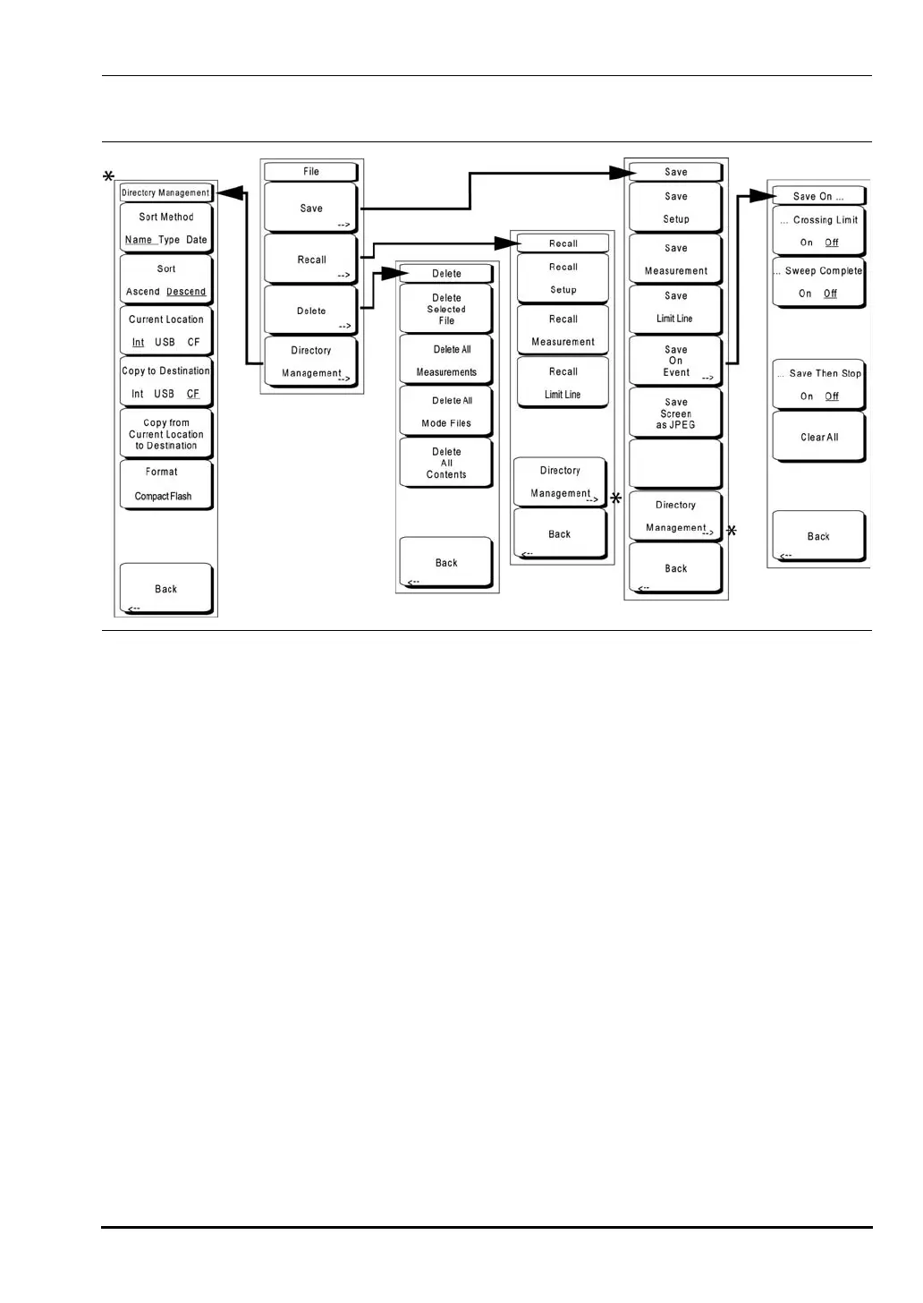 To access the File Menu, press the Save/Recall function hard key or press the Shift key, then
