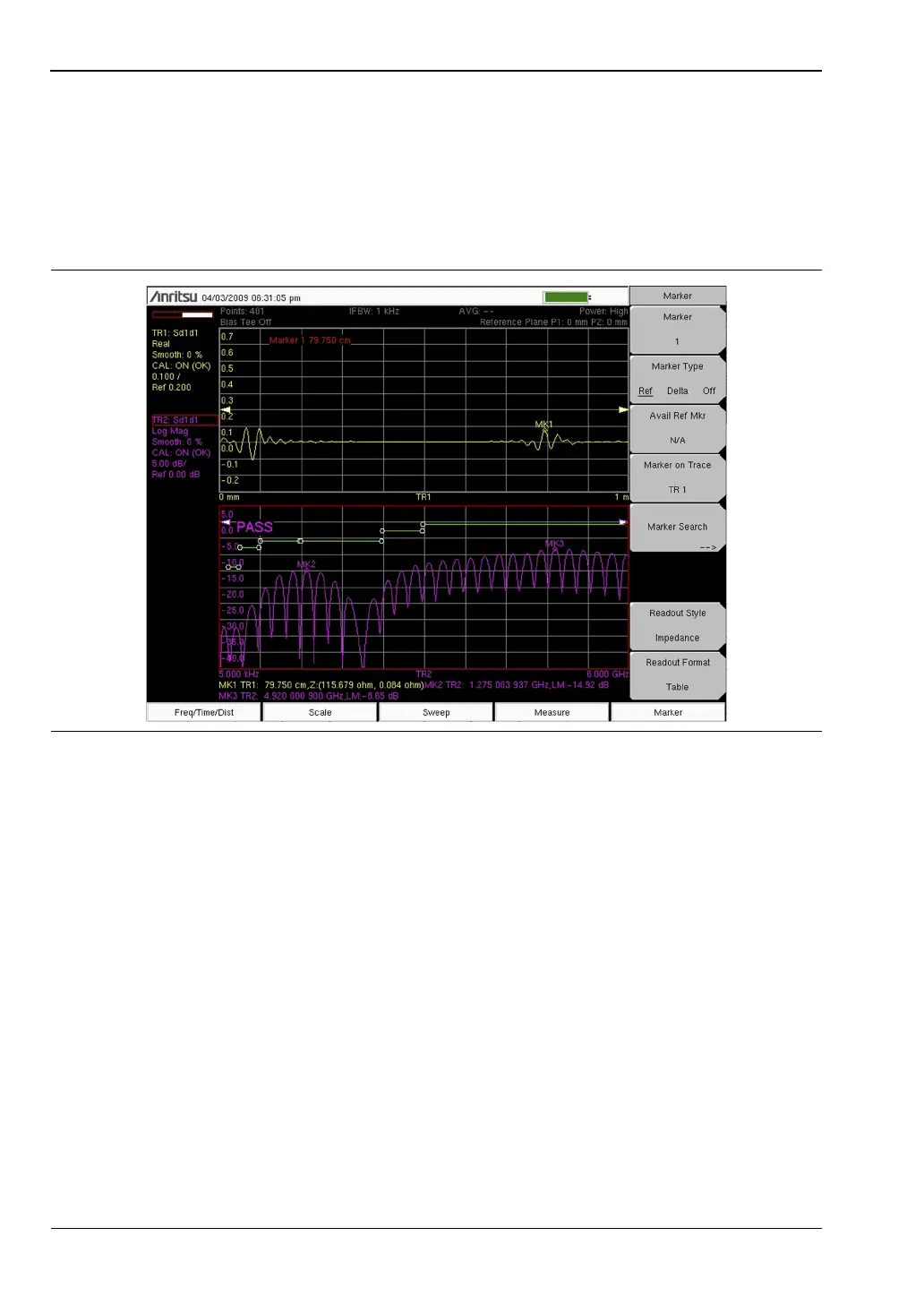 different frequency points. In the distance domain, a marker is used to check the impedance