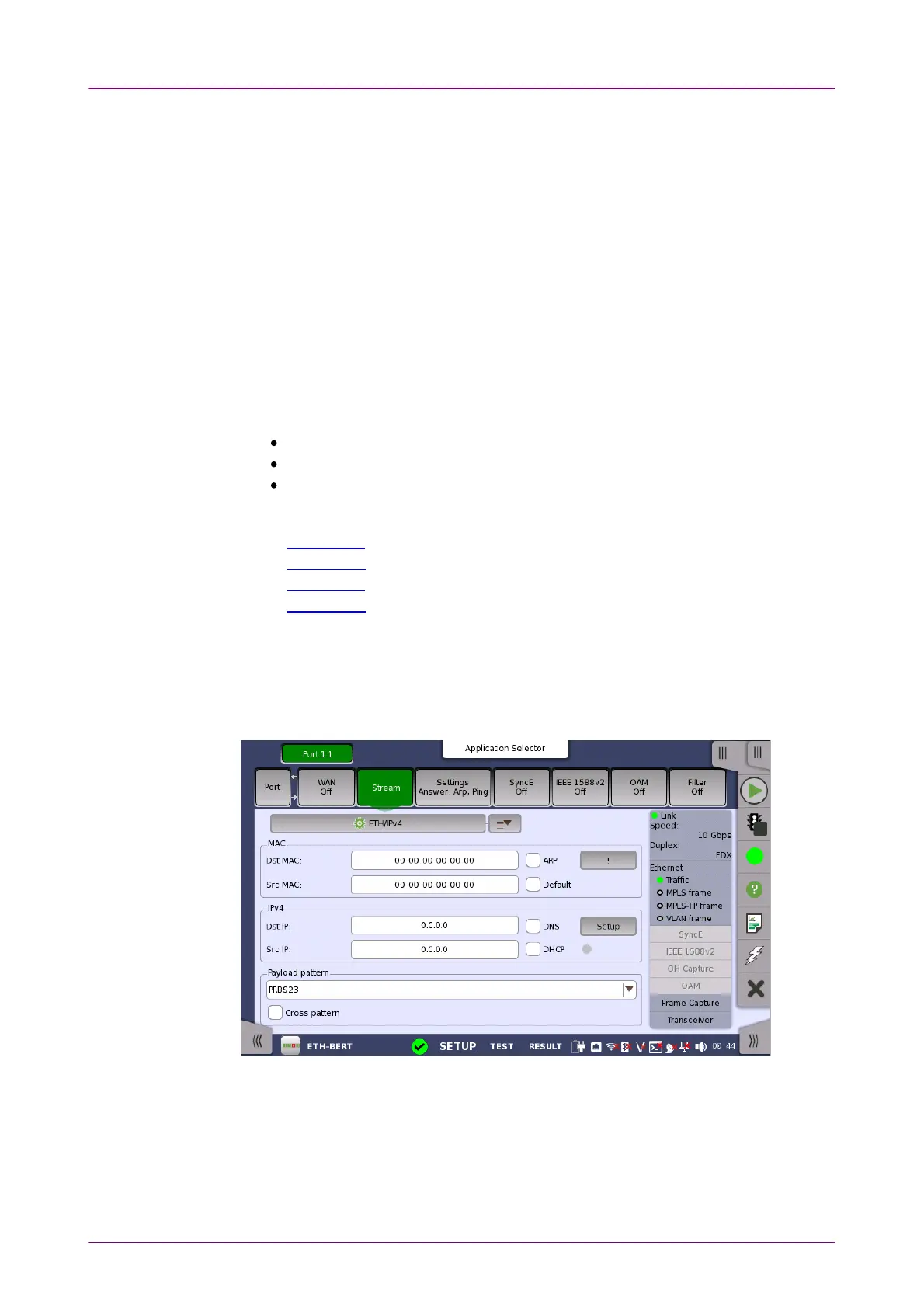 This screen contains the setup of the Ethernet frame content transmitted by the