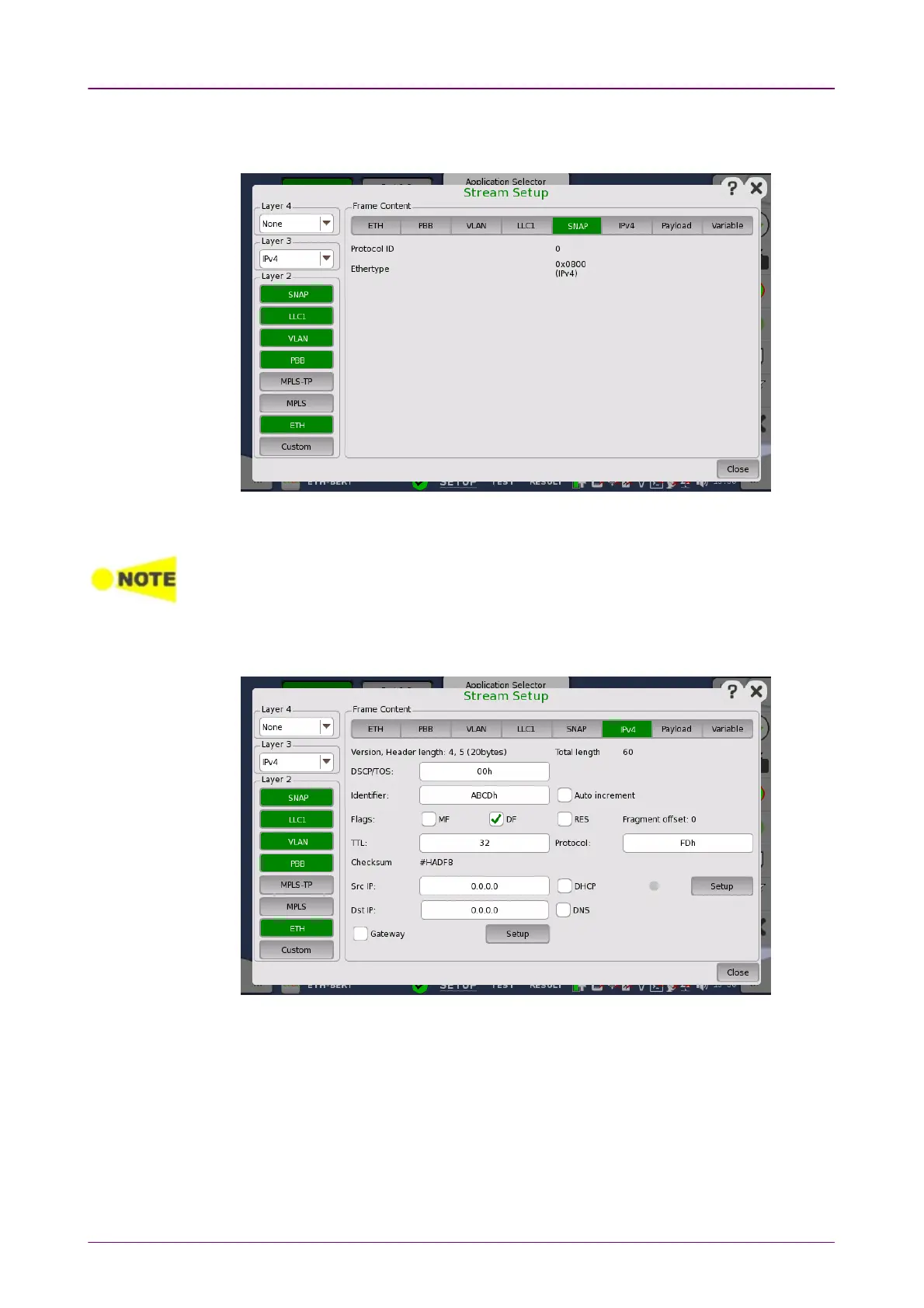 Touching the IPv4IPv4 layer button displays the parameters available for the