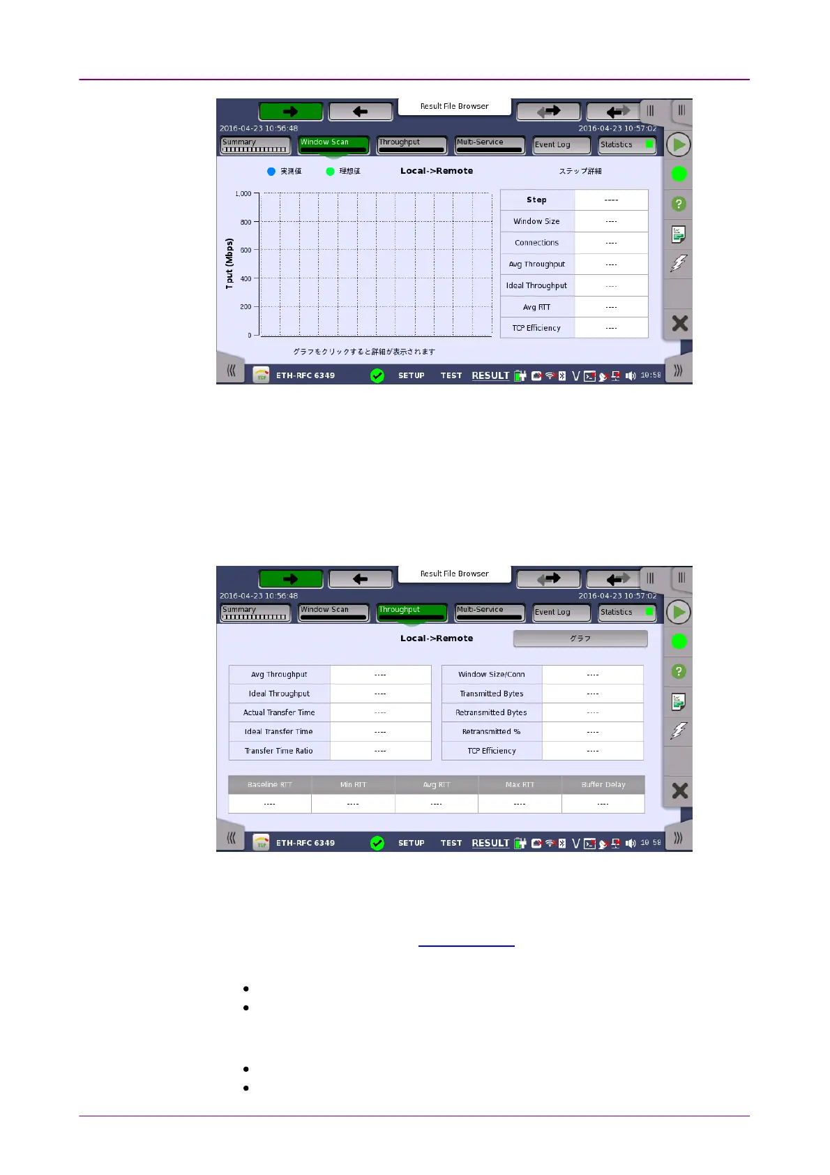 This screen presents the Throughput results in graph or table. Touch the GraphGraph