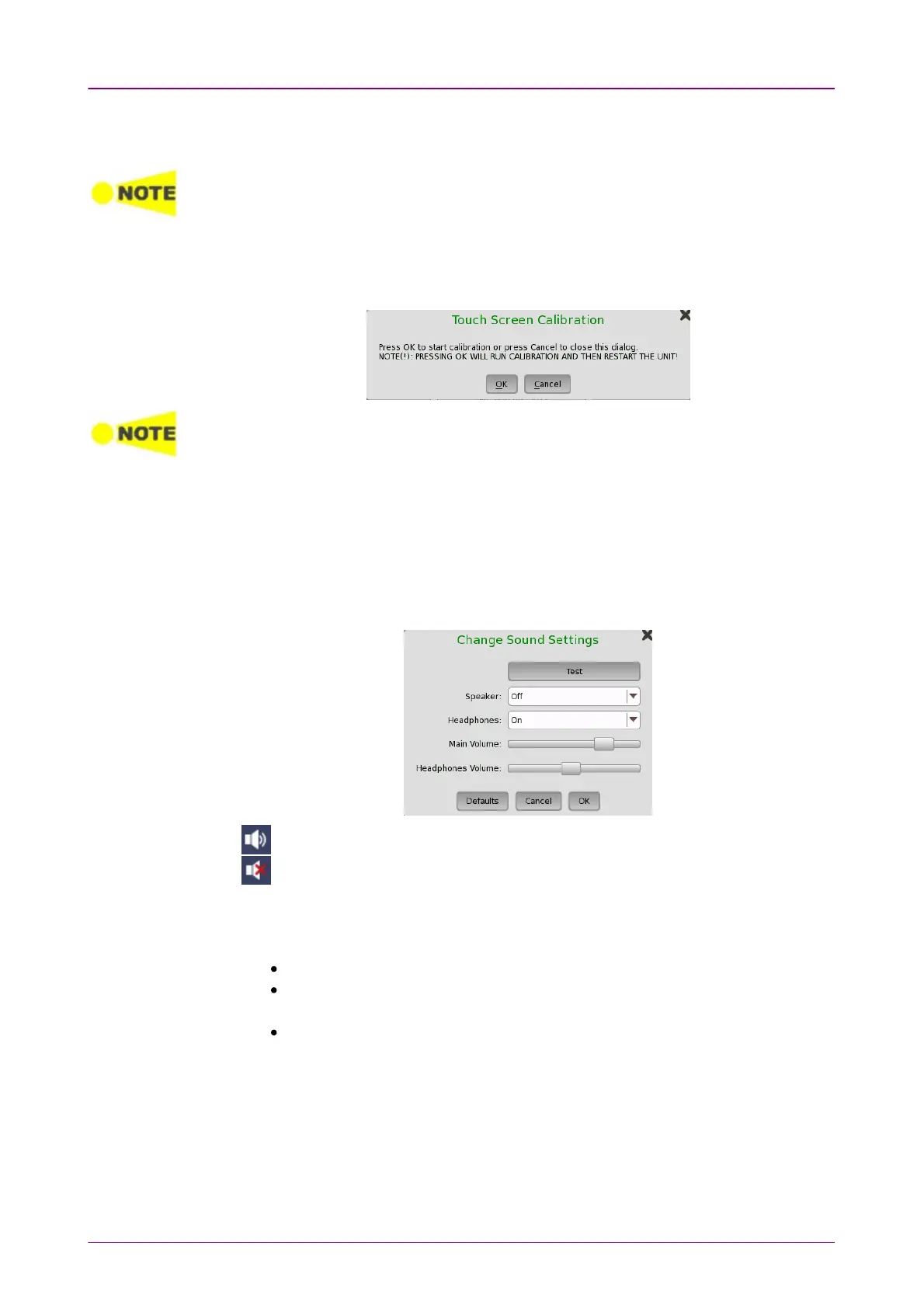 Allows you to calibrate the touch screen. Touch OKOK in the dialog box to start