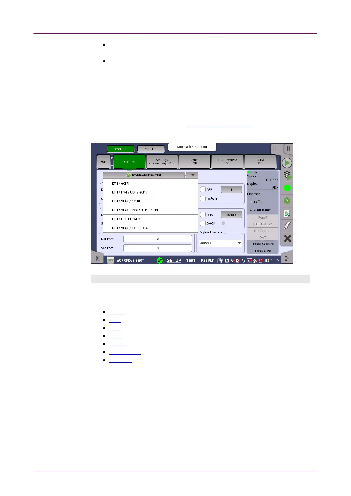 In the eCPRI/RoE BERT application, the SNAP, LLC1, PBB, MPLS-TP, MPLS,