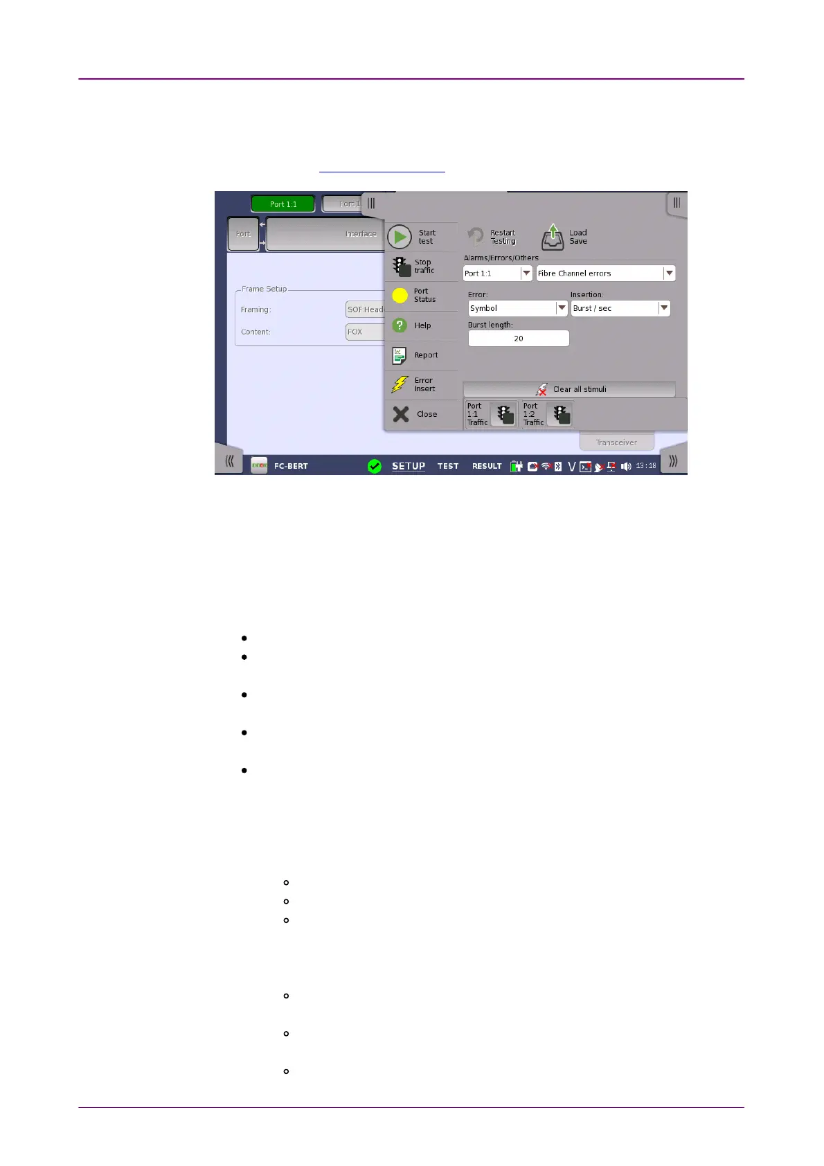 Select the port to insert errors, and the stimuli type. The settings items vary