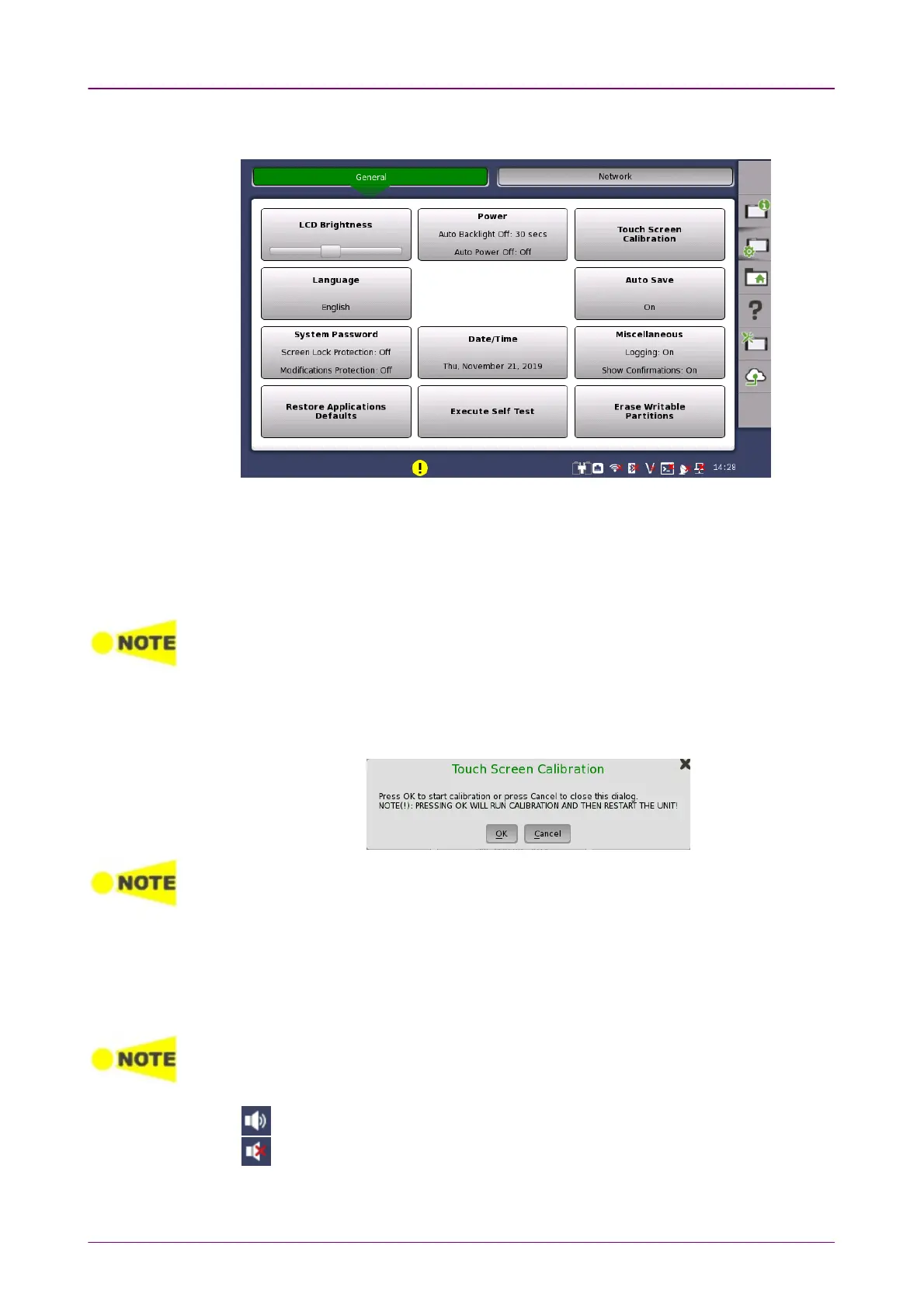 Allows you to calibrate the touch screen. Touch OKOK in the dialog box to start