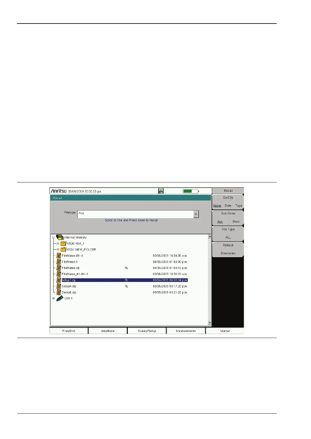 The recall menu enables you to view all the Measurement and Setup files in the internal