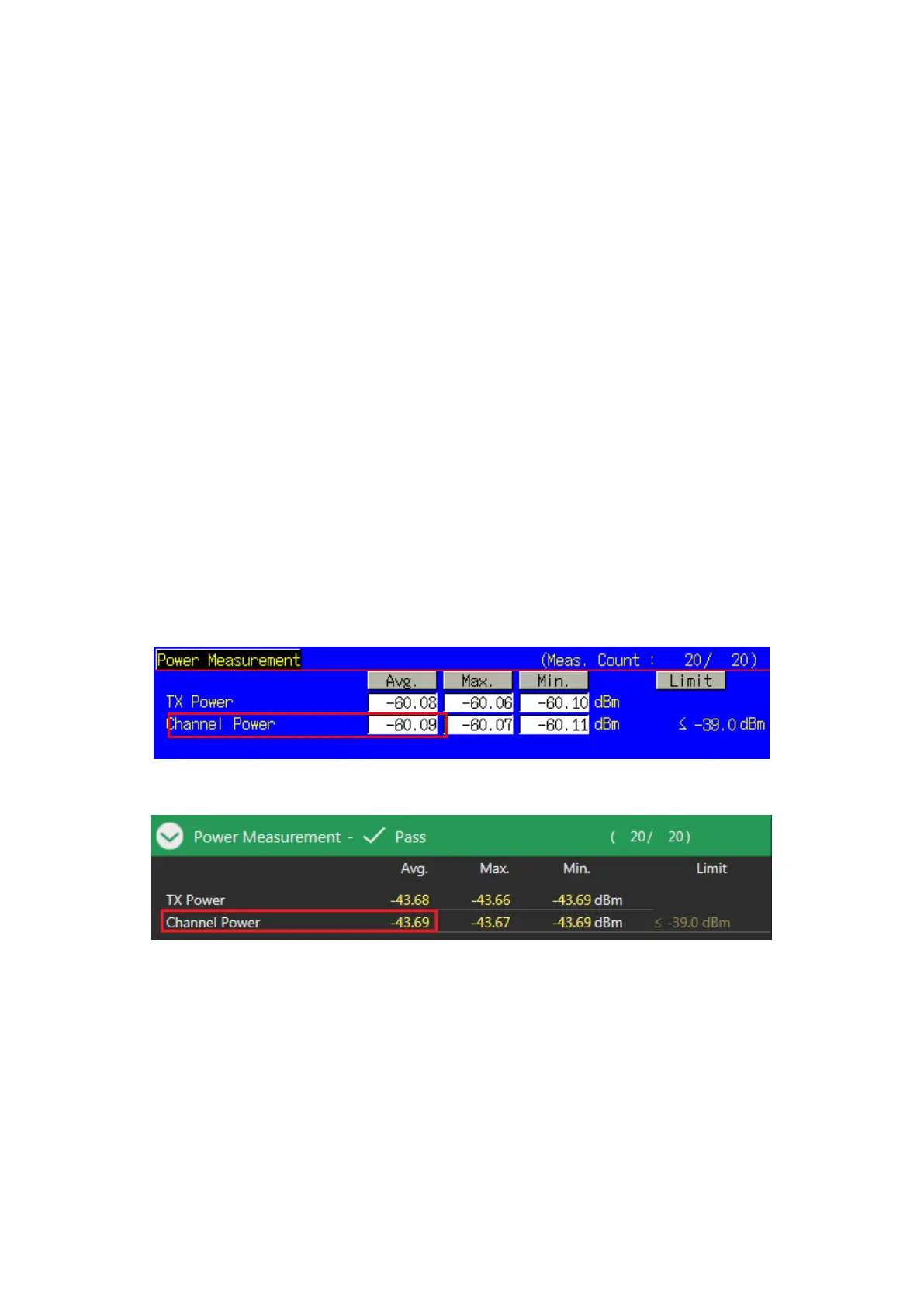 6. Execute CHPWRPASS? to check that the Channel Power measurement Pass/Fail judgment is Pass.