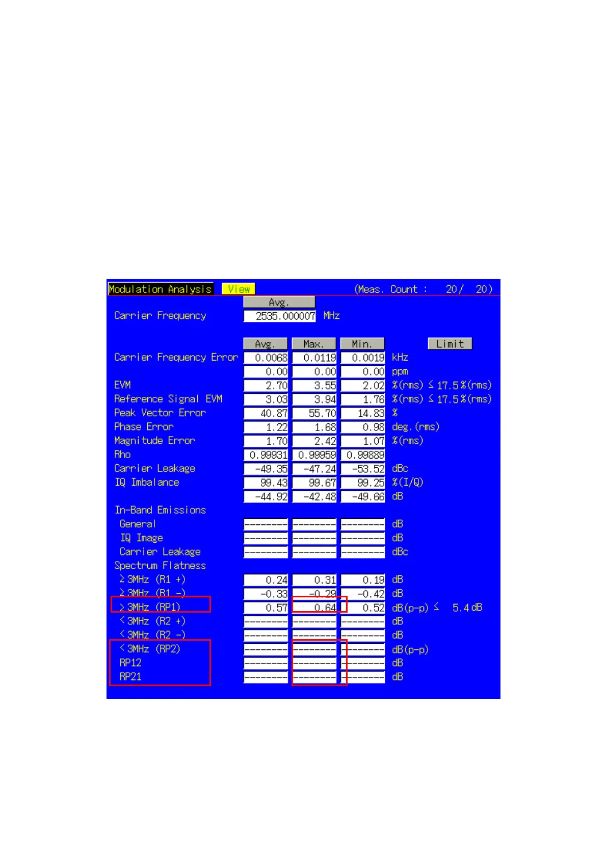 4. Execute SPECFLAT_RP1? MAX to read the MAX Spectrum Flatness (Spectrum Flatness ≥ 3 MHz (PR1))