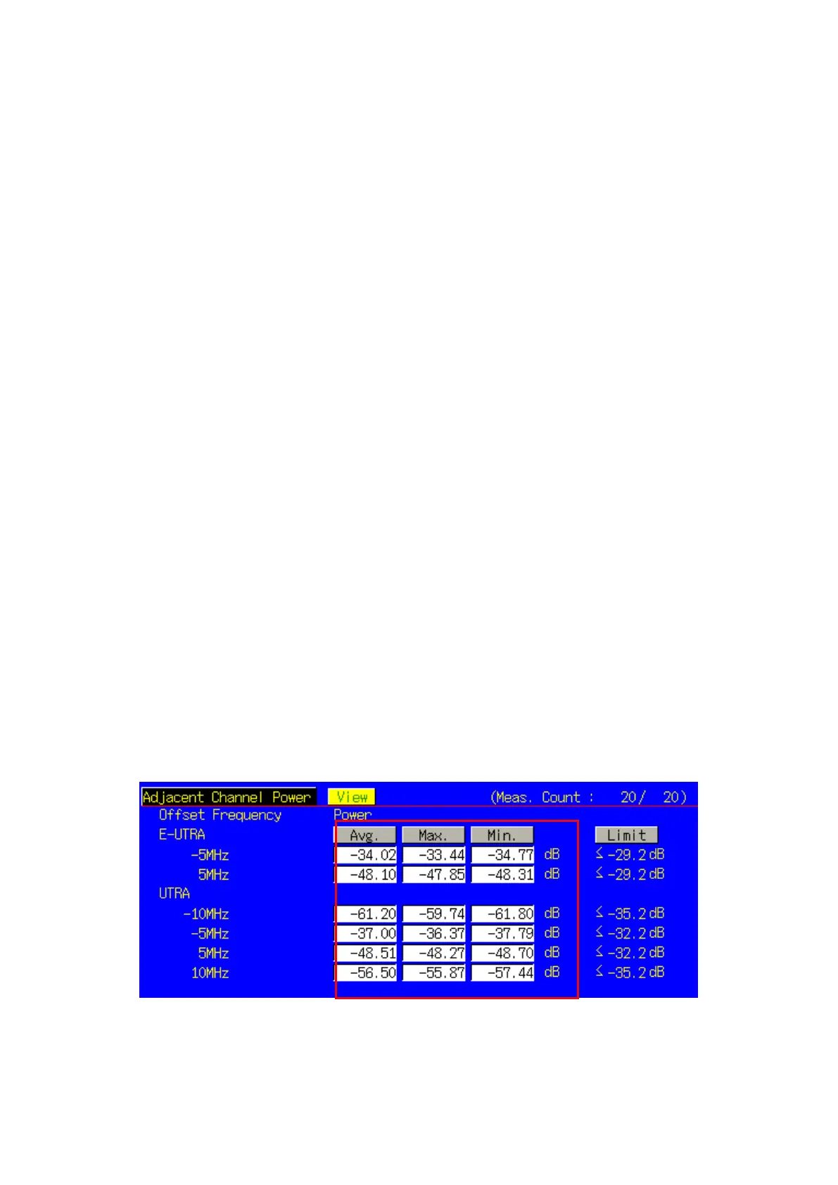 2. Execute TP_ACLR_E -36.2 to set E-UTRA Pass/Fail limit value to –36.2 dB.