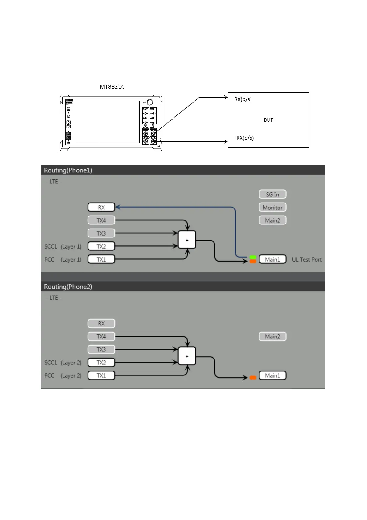Figure 2.2.1-4 Connection Diagram and Internal Routing Diagram for 2DL CA and 1UL CA, Tx and Rx