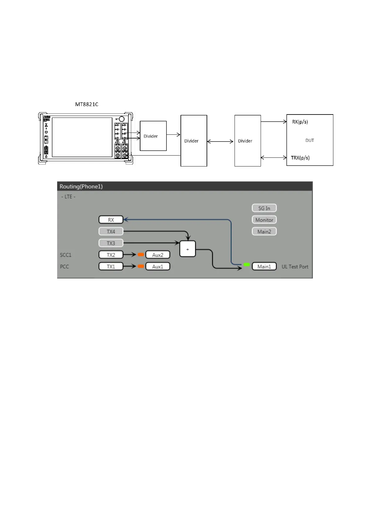 Figure 2.2.1-5 Connection Diagram and Internal Routing Diagram for 2DL CA and 1UL CA, Tx and Rx Test