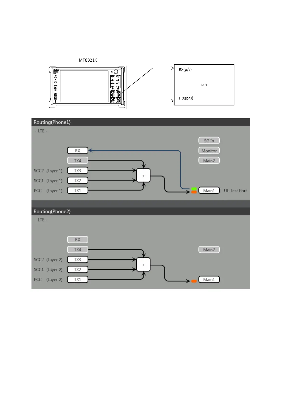 This example shows the connection diagram for the 3DL/1UL CA and Rx diversity condition. The DL signals of PCC,