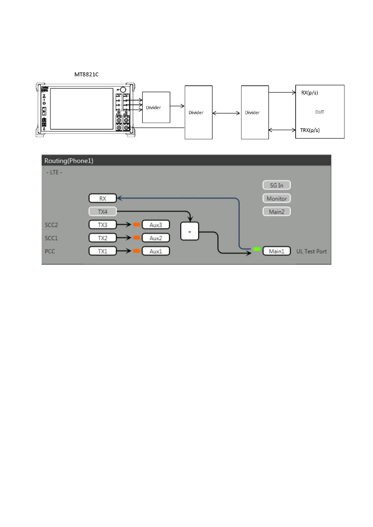Figure 2.3.1-5 Connection Diagram and Internal Routing Diagram for 3DL CA and 1UL CA, Tx and Rx Test