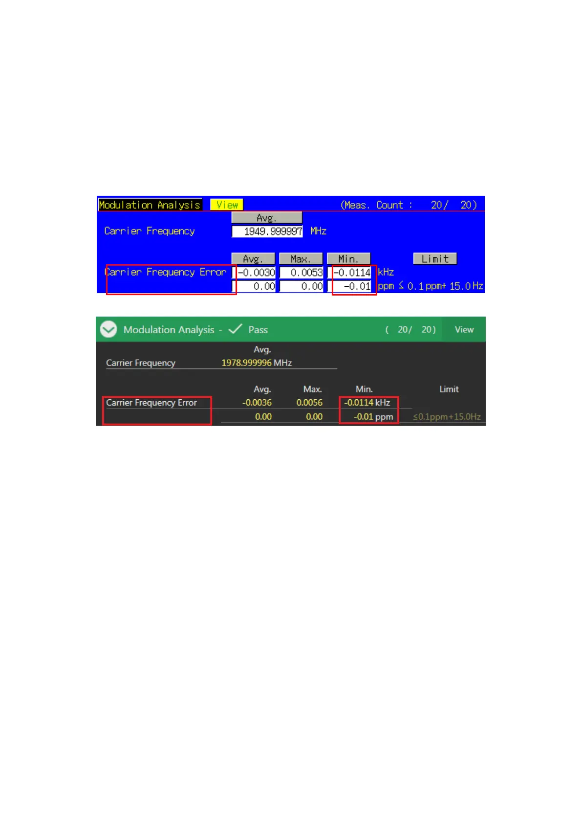 5. Execute WORST_CARRFERR? PPM to read the Carrier Frequency Error (1 = 0.01 ppm) measurement result.