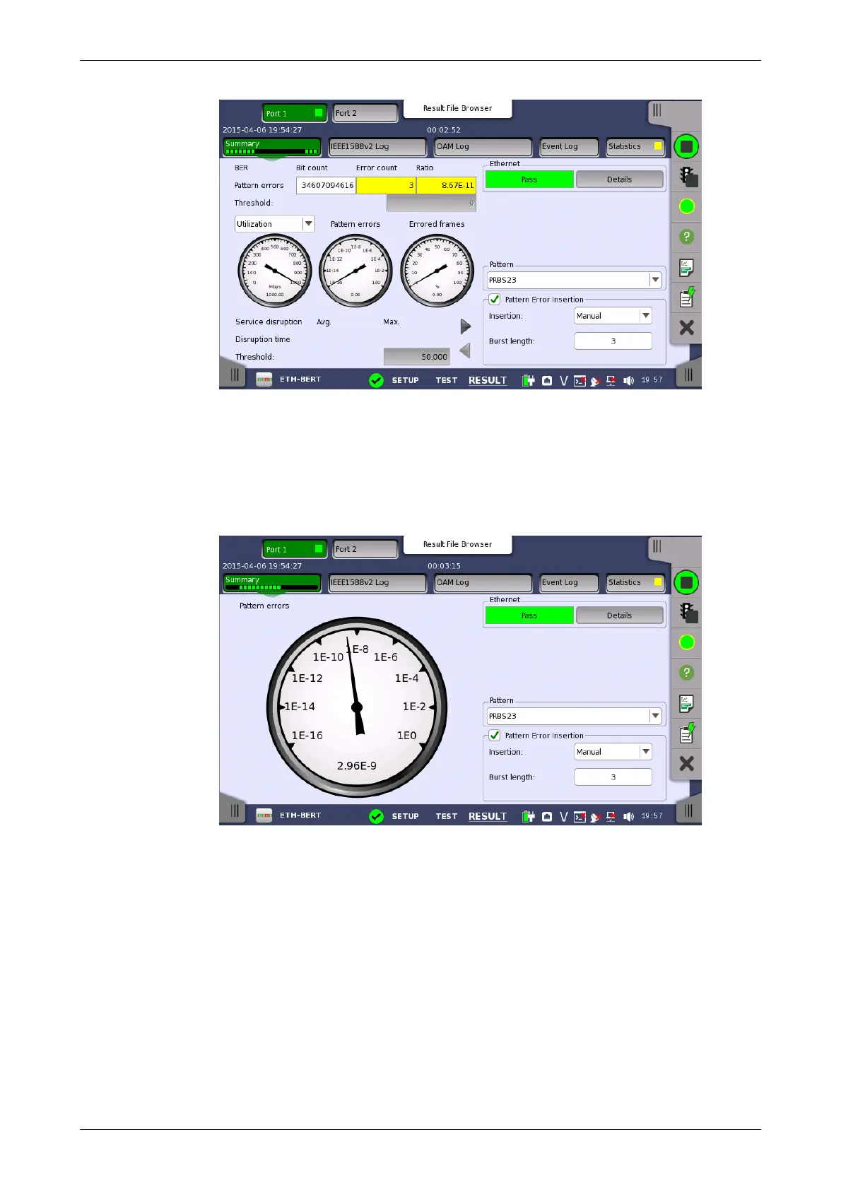 This screen contains a summary of the results of the Ethernet BERT test. The