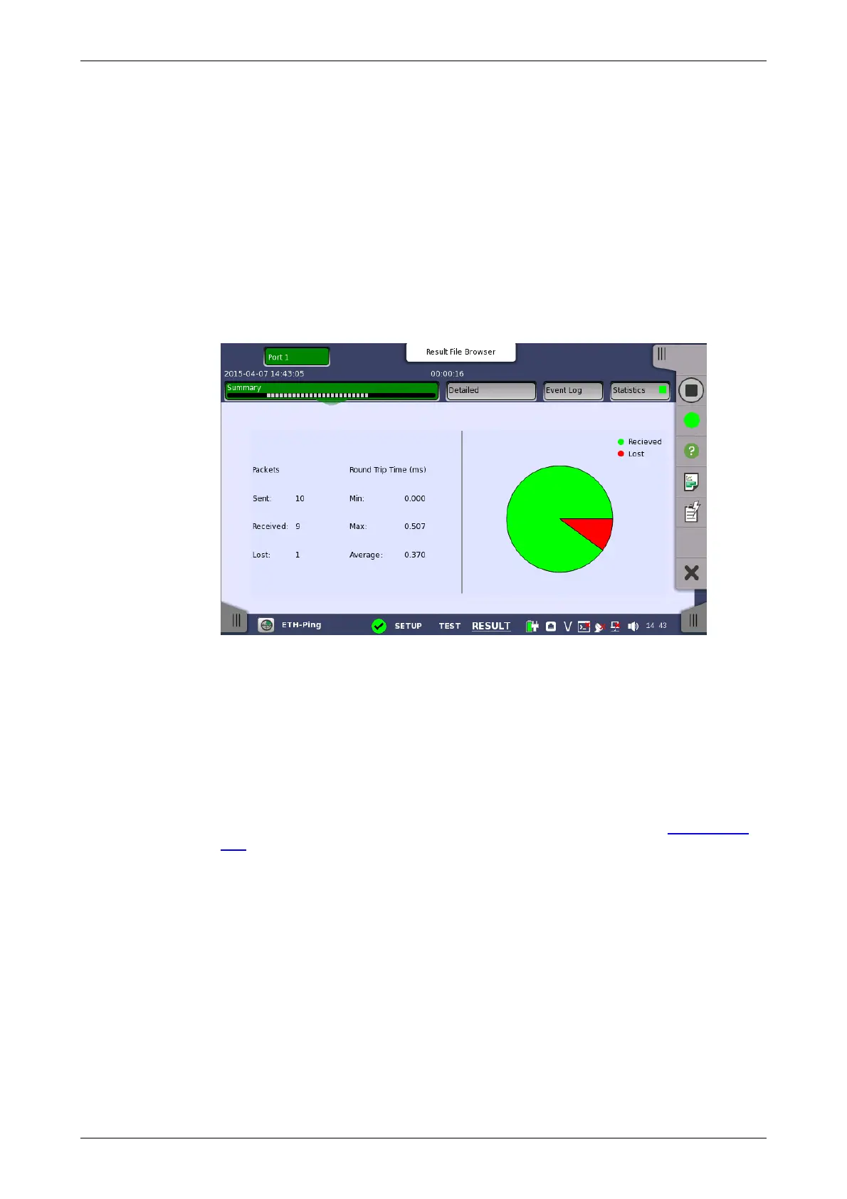 This screen presents a summary of the results of an Ethernet Ping test. The