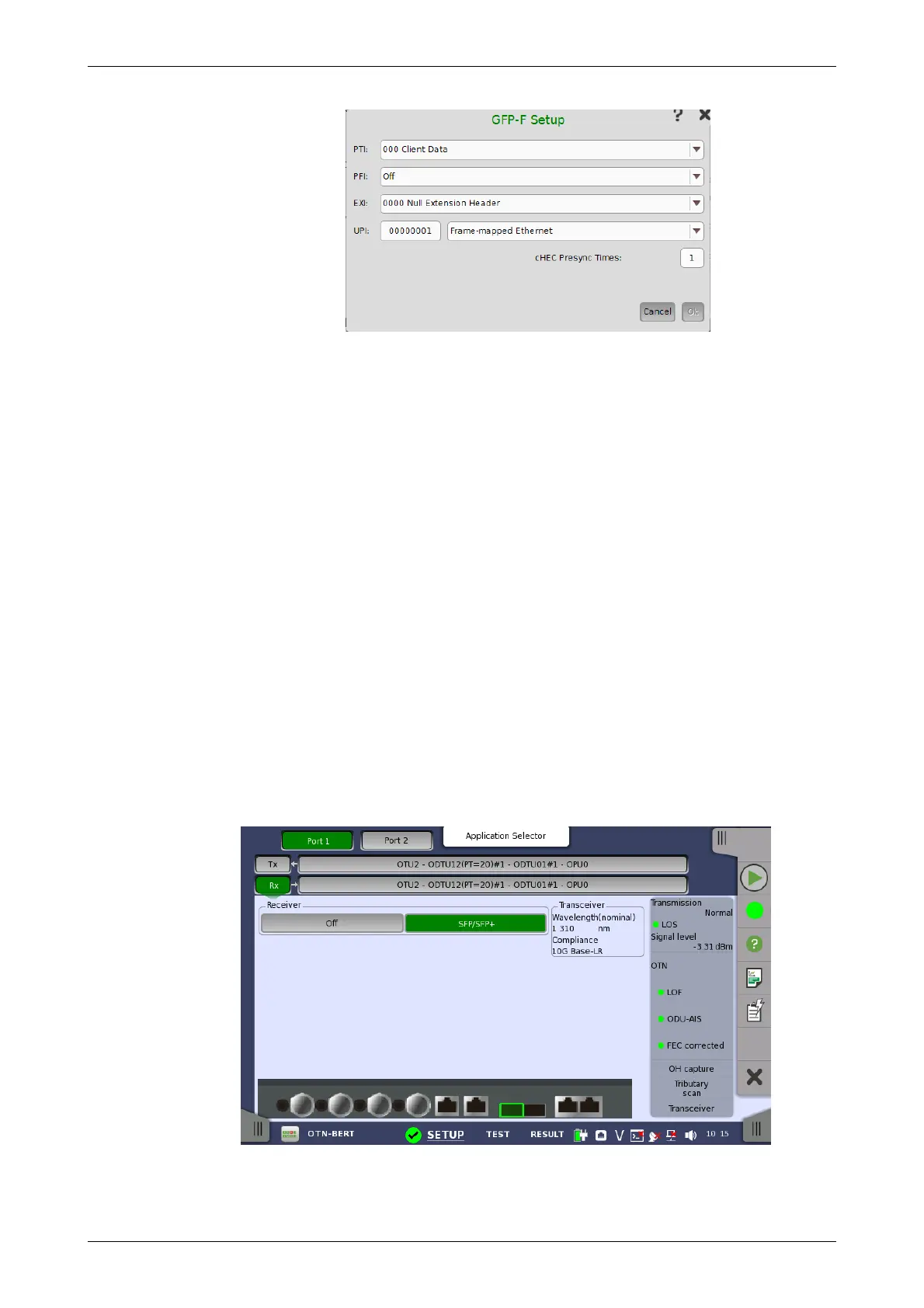 When the receiver is set up with an OTUk interface, touching the Rx button in