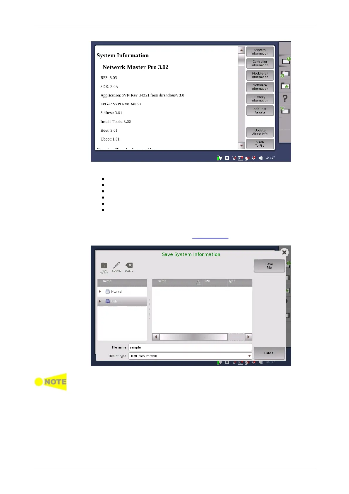 To save the instrument information in an HTML file, touch the Save To File
