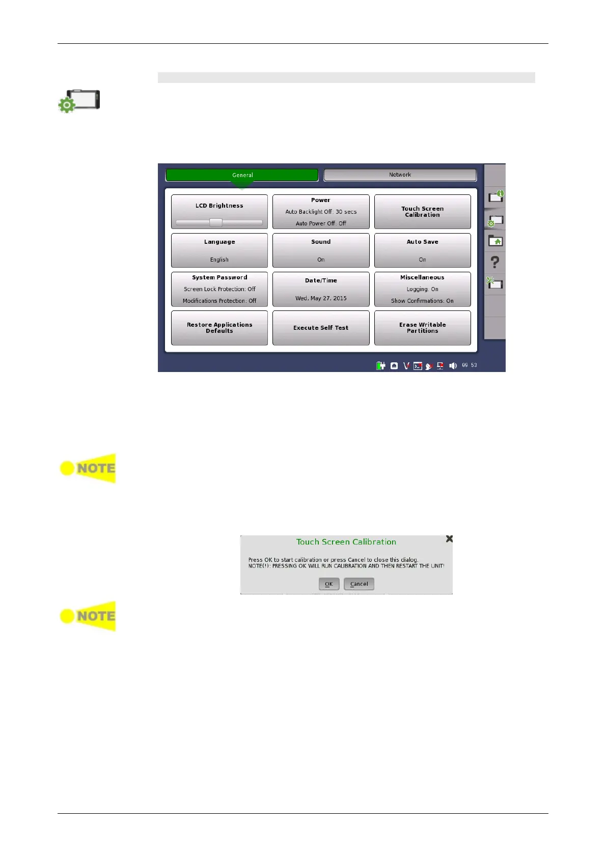 Allows you to calibrate the touch screen. Touch OK in the dialog box to start
