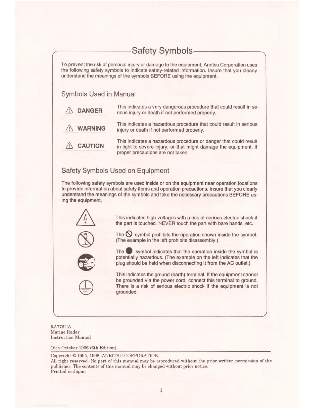 Anritsu RA772UA - Safety Information; Manual Safety Symbols; Equipment Safety Symbols