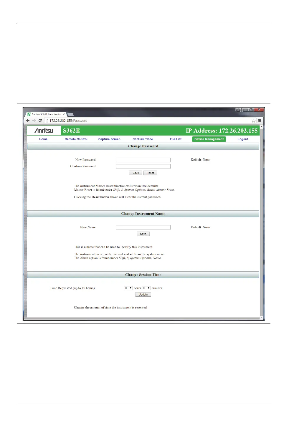 Click the Device Management tab on the menu bar to set or clear the instrument password, or