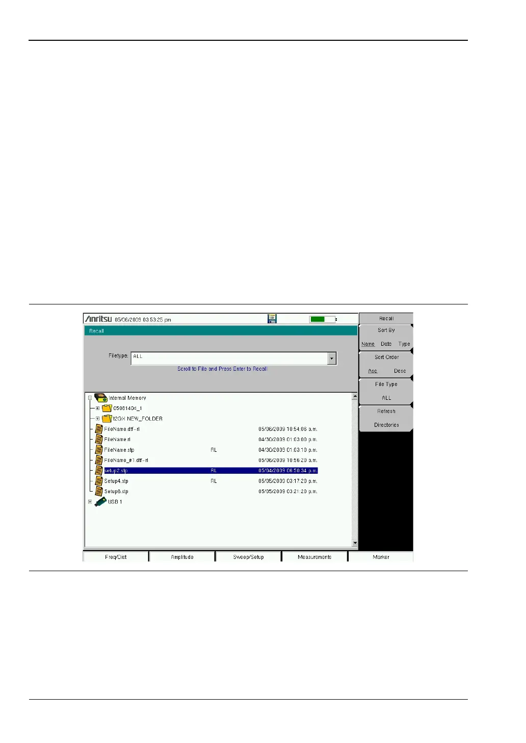 The recall menu enables you to view all of the Measurement and Setup files in the internal