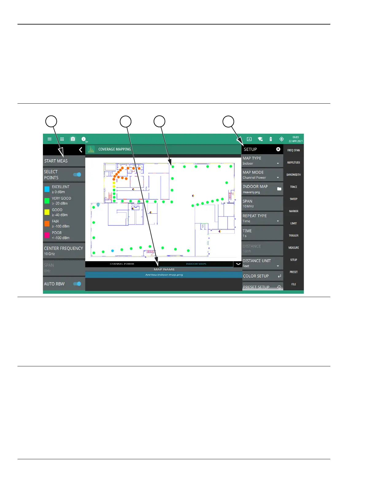 annotated with dots that are colored-coded to the received signal strength/power. The instrument logs data