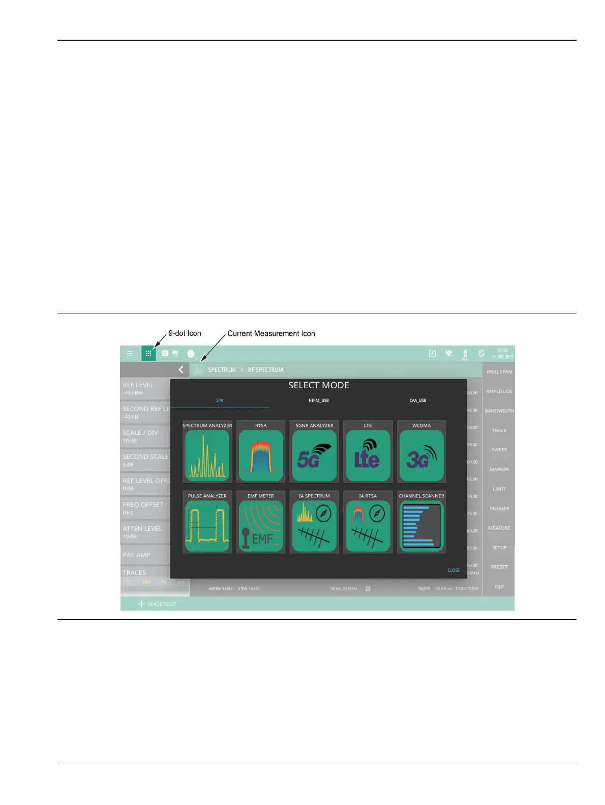 The instrument analyzers are selected from the 9-dot icon or the current measurement icon. To select an