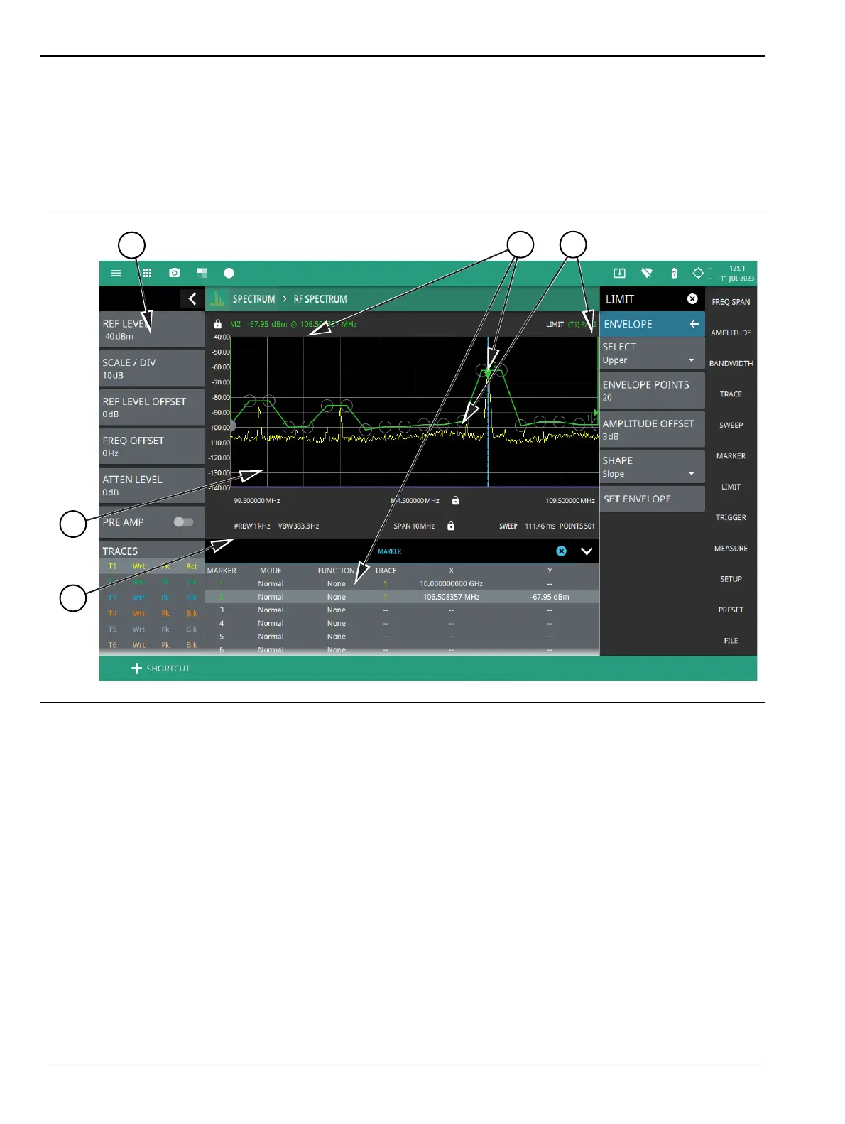 VIEW > RF Spectrum. The sample display below is set up with a single trace enabled and with a marker and