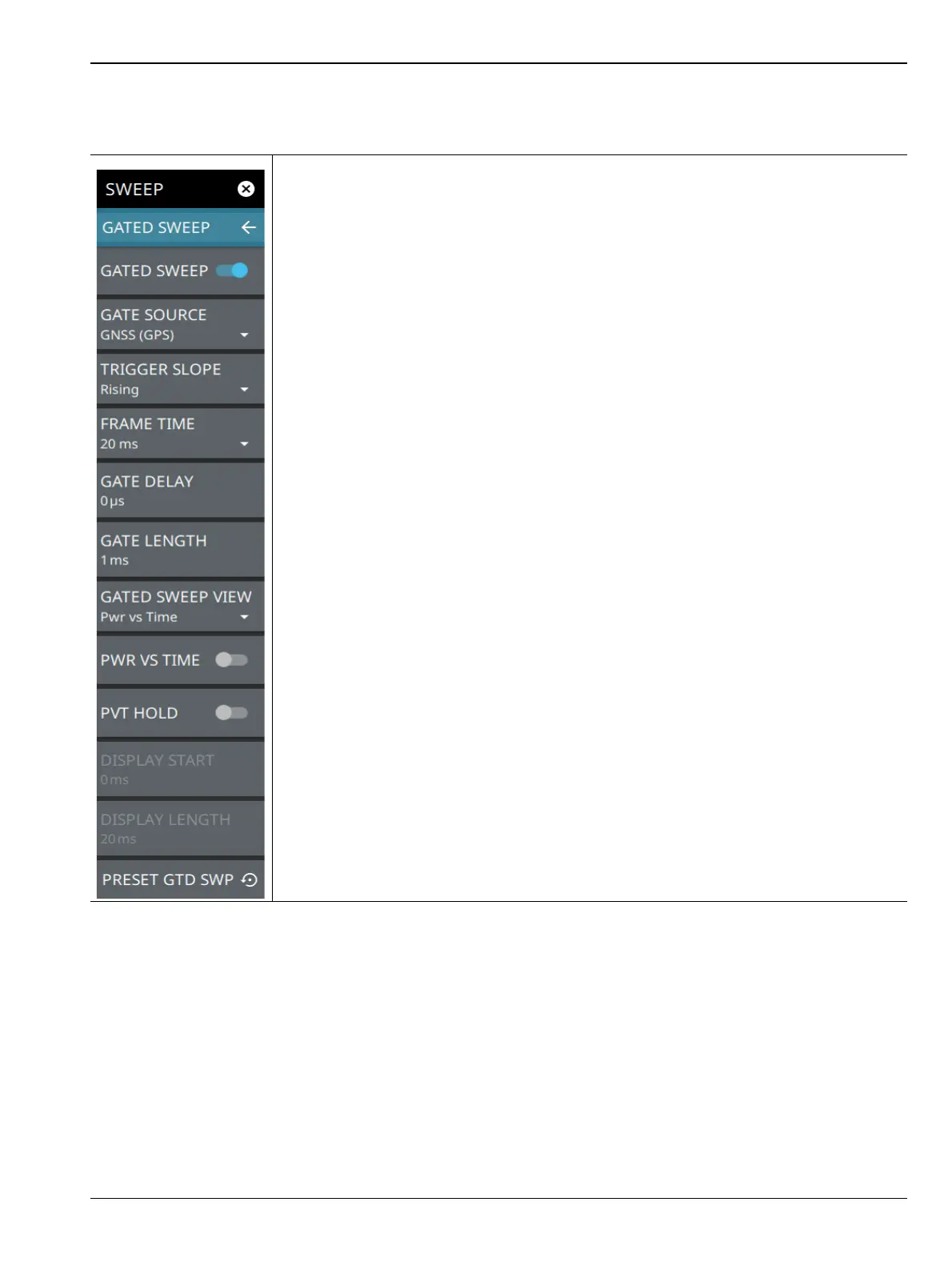 PRESET GTD SWP: Presets gated sweep settings to default values.