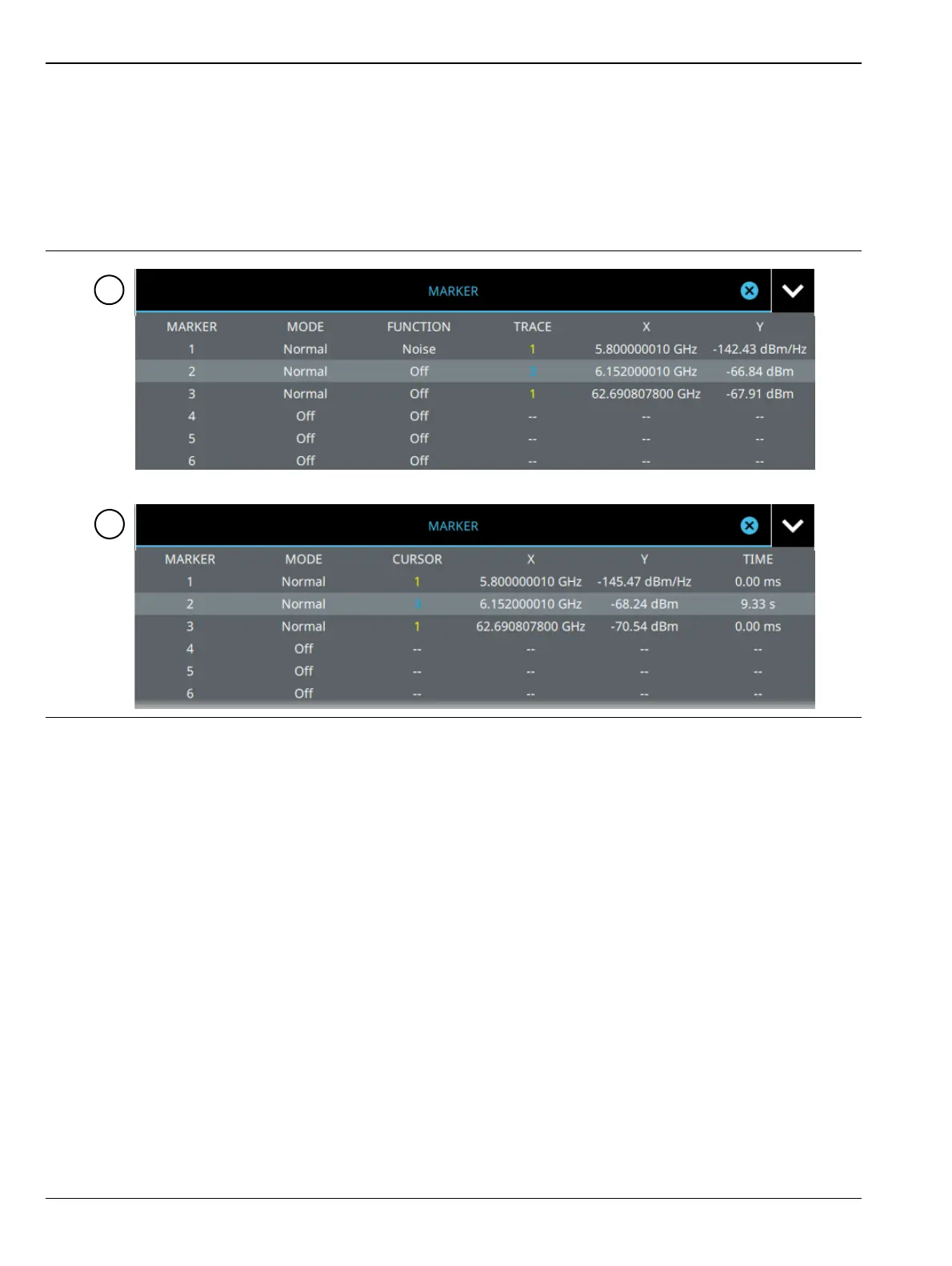 The marker table display is useful for displaying many marker parameters at once. The examples shown are