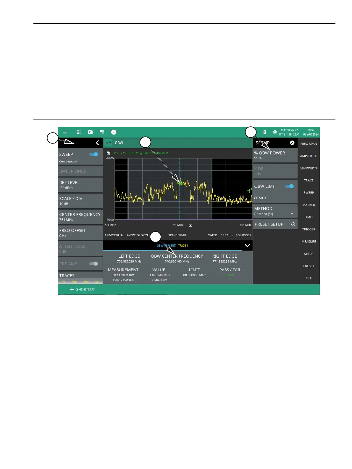 • Toggle OBW limit testing if you wish to see pass/fail test results