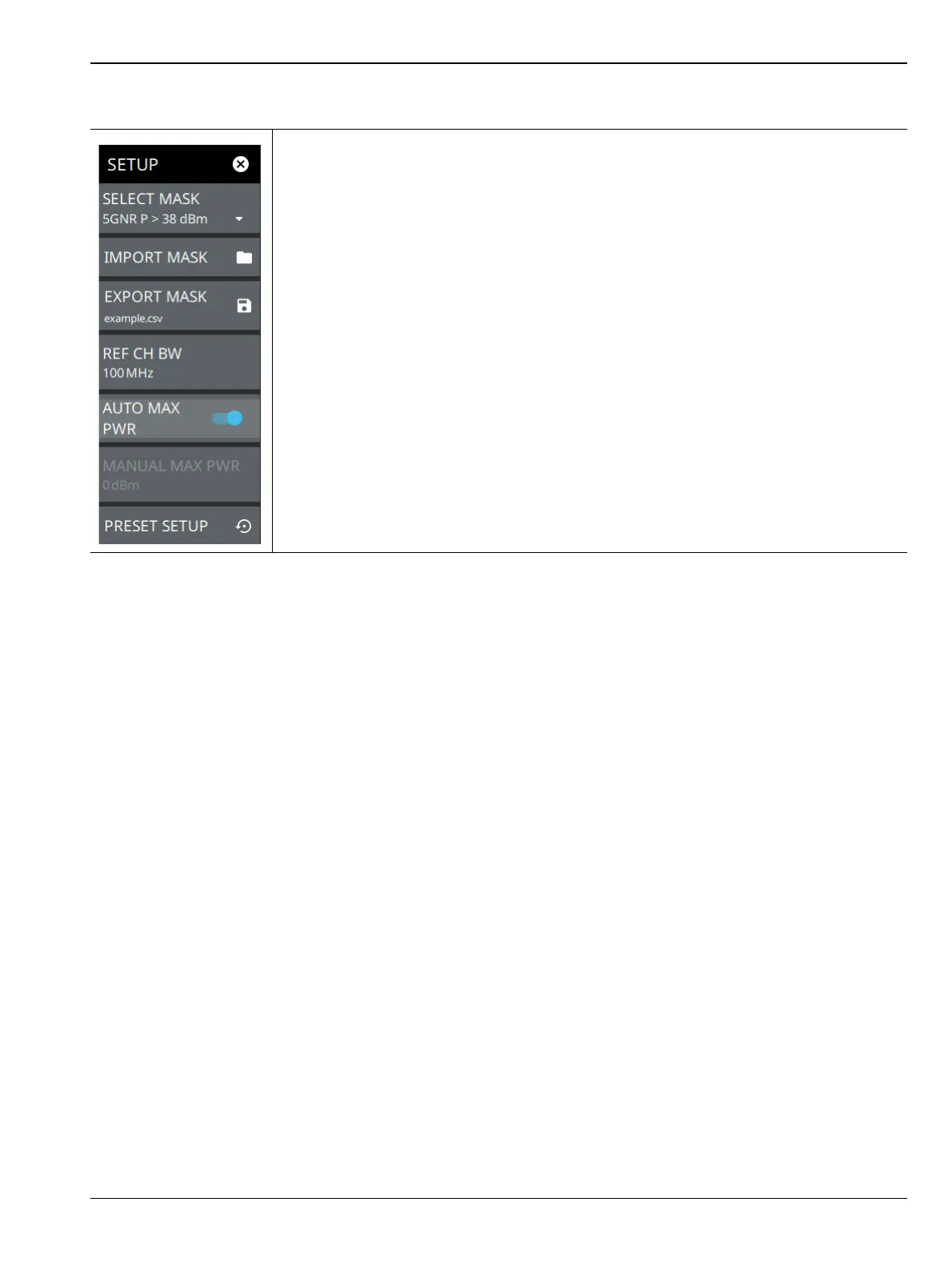 MANUAL MAX PWR: Used to manually enter the reference channel power for masks