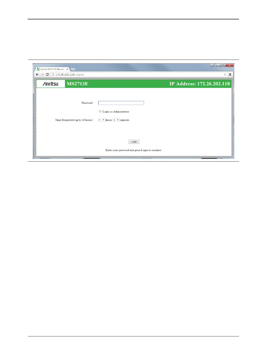 The Web Remote Control Login page opens following browser connection to the instrument.